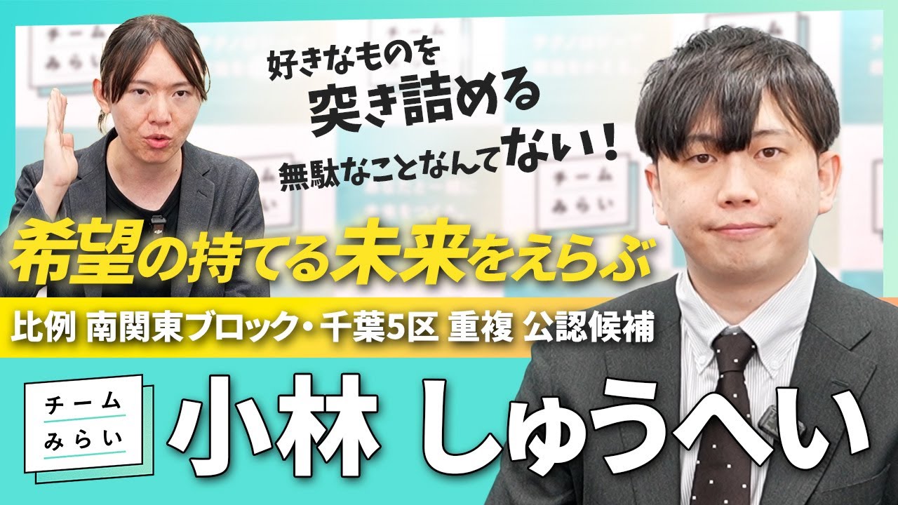 まだ選挙権を持たない子どもたちが、やがて大人になったとき、どんな社会に迎え入れられるのかは、いま選挙権を持つ私たちの選択によって決まります。未来に希望が持てる選択を、私たちは重ねていきたいと思います。現在の社会には、不合理な仕組みが多くあります。私はエンジニアとして、こうした社会のバグに立ち向かい、正直者こそが得をする社会、真面目に働いている人こそが報われる社会、合理的でシンプルな社会を目指します。その積み重ねの先に、全ての人が自分らしく過ごせる未来が来ると信じています。